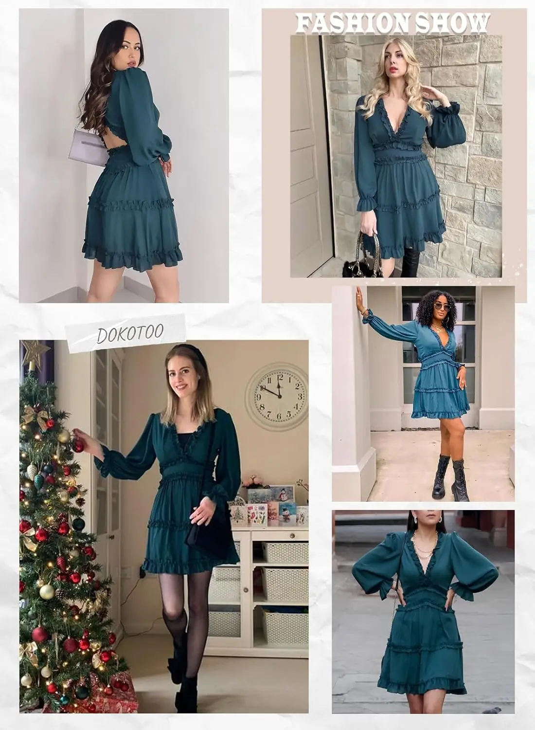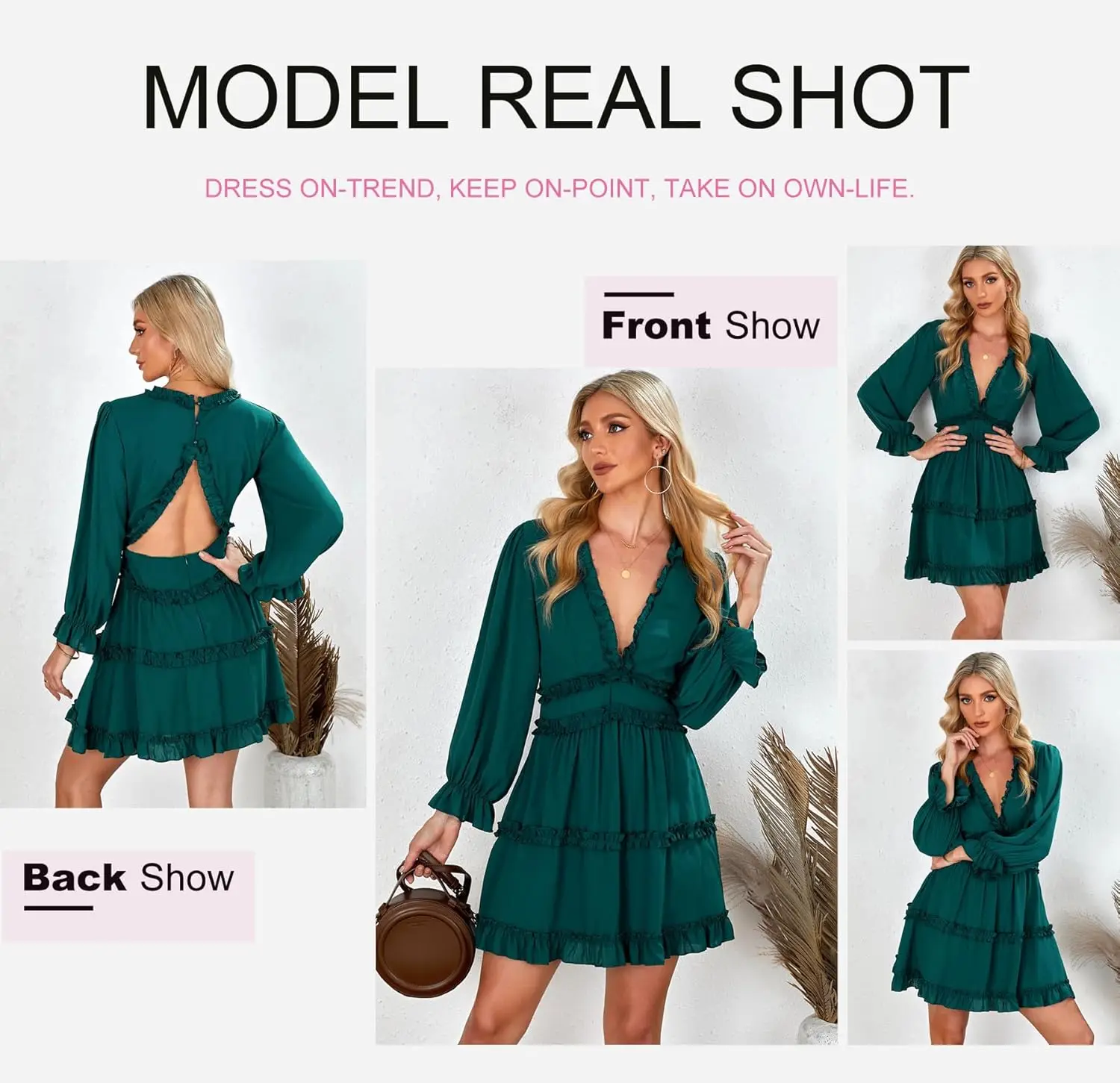 Women's 2025 Summer Spring Solid Pattern Casual Dress Washable Worsted Deep V-Neck Ruffle Long Sleeve Open Back Flowy Mini Dress